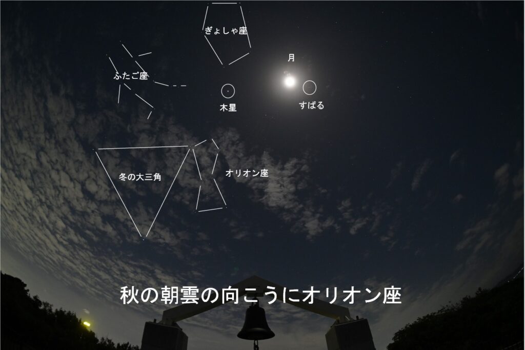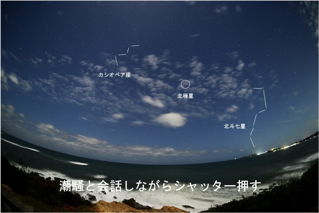 撮影ポイントは「夏井ヶ浜はまゆう公園」(芦屋町)だ。我が家から車で早朝走って20分くらい。4時半くらいに到着したかな。車降りるとすごい「轟音」がしてて何だろうと思ったよ。公園は小さな岬の突端にあるけど、そこに着くと白い波しぶきが立っていて、波が打ち砕ける音が「轟音」に聞こえるほど大きかったよ。しぶきが月明かりに白く照らされて少し怖い感じさえした。風はあまり強くなかった。まあ、そんなところで1時間ばかり星空を撮影したよ。