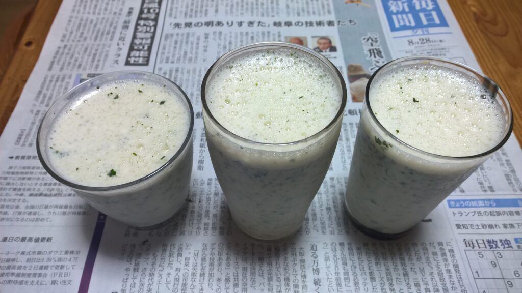 それで今日はスムージーにしようと思ったわけよ。その結果が写真。モロヘイヤひとつかみ+バナナ1本+豆乳適当。
