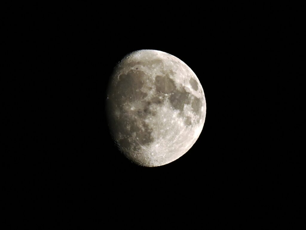 二枚目の写真はそののち改めて撮影した月の写真だ。ふつうは黄色く光って優しく見える月もなんだかおっかないね。国立天文台の「今日のほしぞら」によると月齢12日だそうだ。
