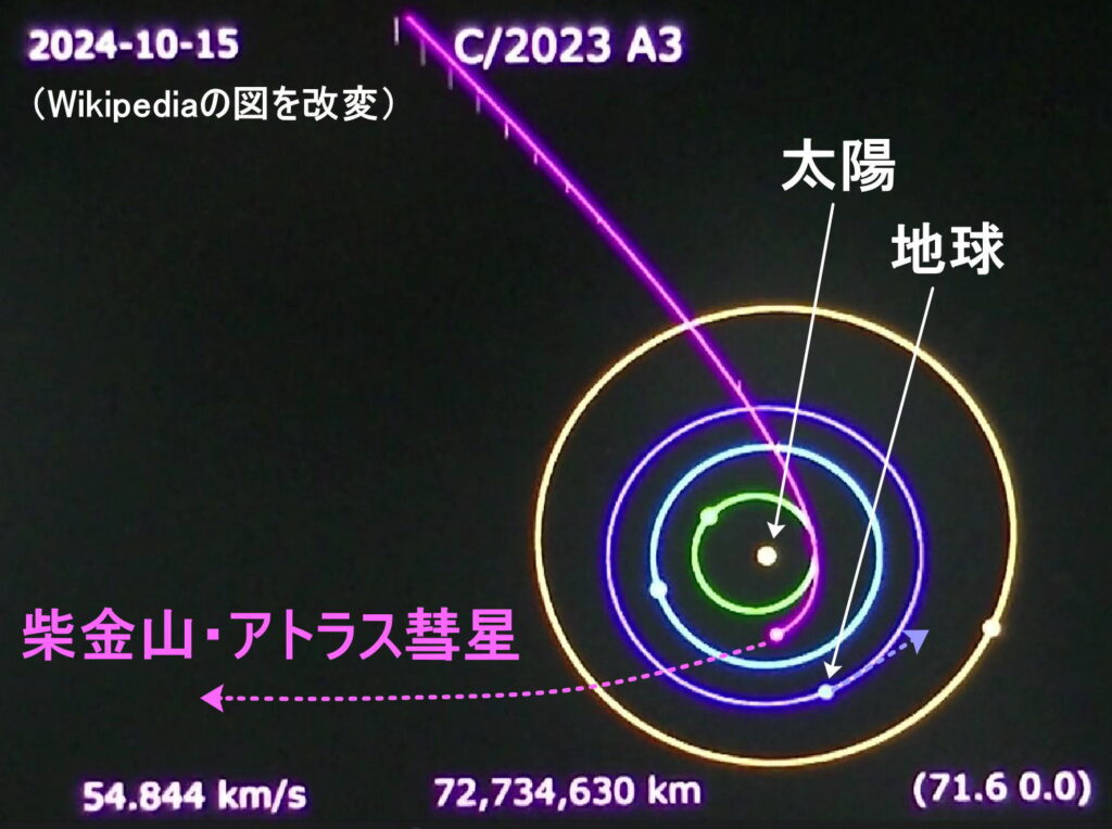 wikipediaには彗星の軌道が動画で示されている。それを静止させ、少し改変して図示してみた。今、彗星は地球から遠ざかっていて、肉眼で見えるのは今だけだ。